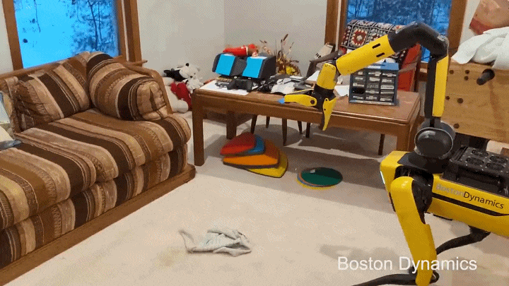 在机械臂的辅助下,四足机器人Spot不仅可以执行开关门、拧阀门、推开关、拖拽重物、种植植物等工作任务,甚至可以完成做家务、收集衣物等家庭任务。