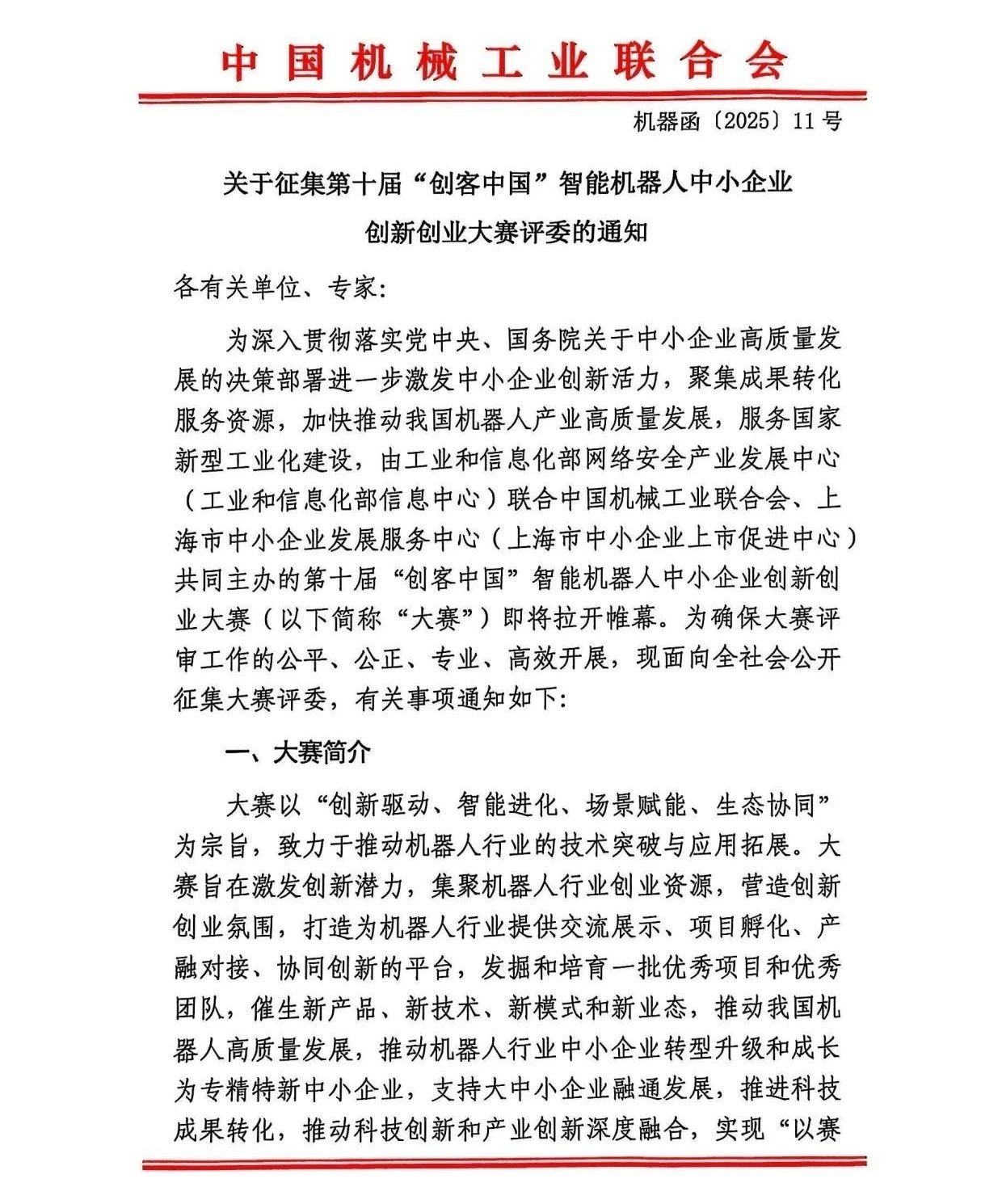 关于征集第十届“创客中国”智能机器人中小企业创新创业大赛评委的通知.pdf