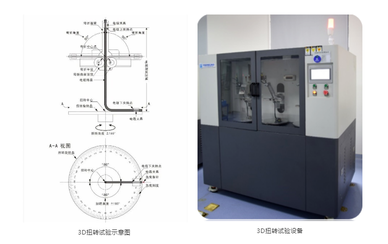 在电缆选型中,考虑不同厂家的电缆选用材料、制造工艺,在使用寿命方面存在差异。为了定性对比不同厂家的电缆,企业可根据机器人中电缆常用的弯扭形式(例如工业或协作机器人中,常见3D扭转应力),制定统一试验条件(弯曲半径、弯曲角度、扭转角度、扭转长度),对电缆进行寿命试验,通过对比导体电阻退化情况,以及外观检查和寿命试验后耐压试验结果,可对比不同电缆的寿命水平。
