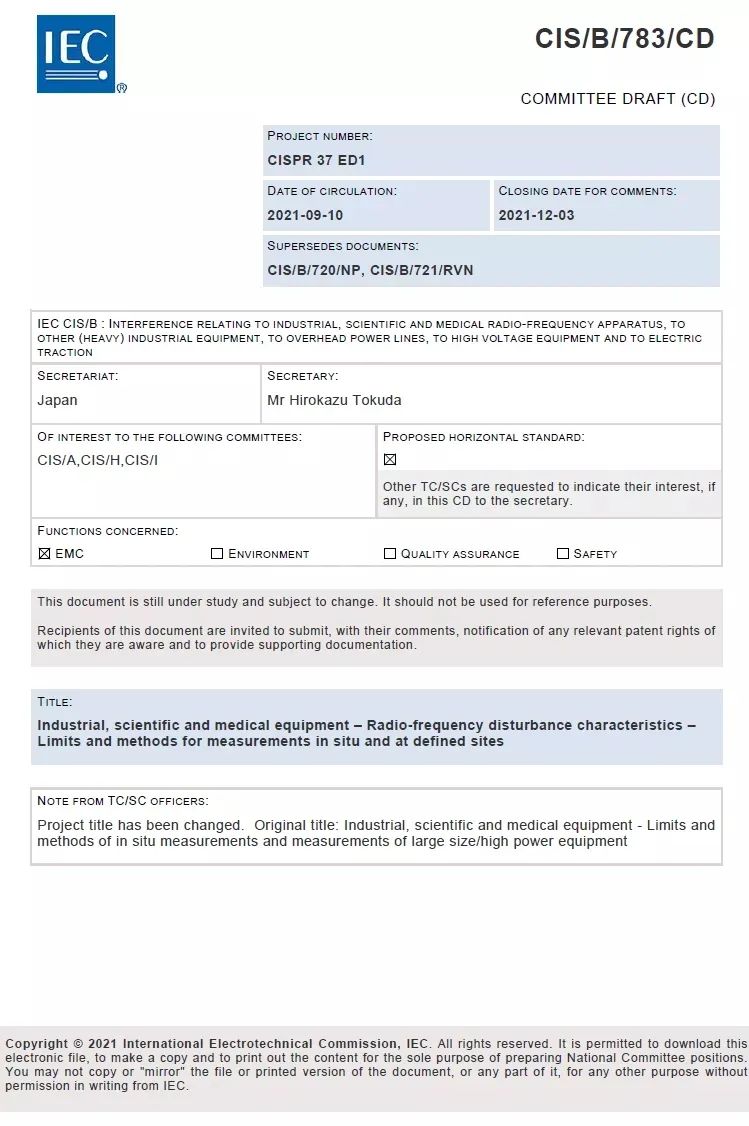 截至2021年8月底,WG7共上传IEC CO协作系统96份过程文件,工作组踊跃推进国际标准CISPR 37《工业、科学和医疗设备 射频骚扰特性 现场和定义场地限值和测量方法 》的制定工作,自去年12月开始意见讨论至今年6月,历经8次线上会议,几十位技术专家的讨论,9月10日正式进入CD阶段。