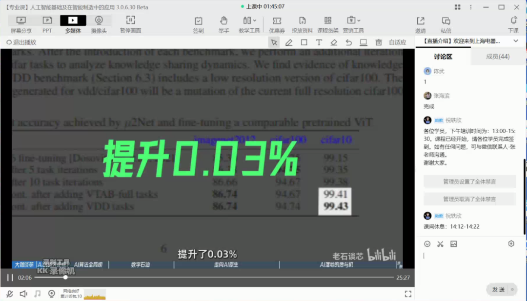 本次培训采取线上直播形式,参加学员共计44人,来自中国电信股份有限公司上海机器人开云·Kaiyun/a>、中国联合网络通信有限公司上海市分公司、中移(上海)信息通信科技有限公司、上海人工智能创新中心、宝信软件股份有限公司、上海建工集团投资有限公司、上海浦东发展银行股份有限公司、上海复旦微电子集团股份有限公司、健康云(上海)数字科技有限公司、新智道枢(上海)科技有限公司、上海有个机器人有限公司等30多家企事业单位。
