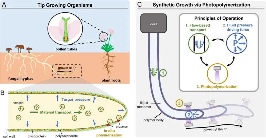 该论文发表在美国国家科学院院刊 (PNAS) 上,文章标题为“Synthetic growth by self-lubricated photopolymerization and extrusion inspired by plants and fungi”(受植物和真菌启发的自润滑光聚合和挤压的合成生长)。