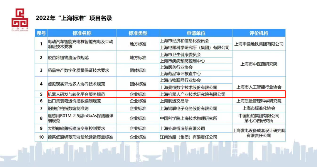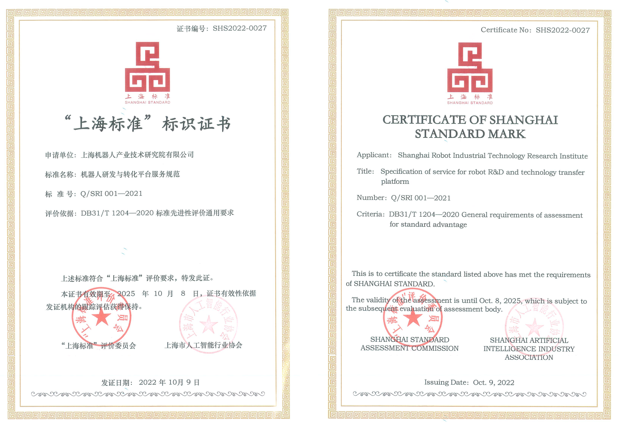 我院企业标准Q/SRI 001-2021《机器人研发与转化平台服务规范》喜获”上海标准“称号。
