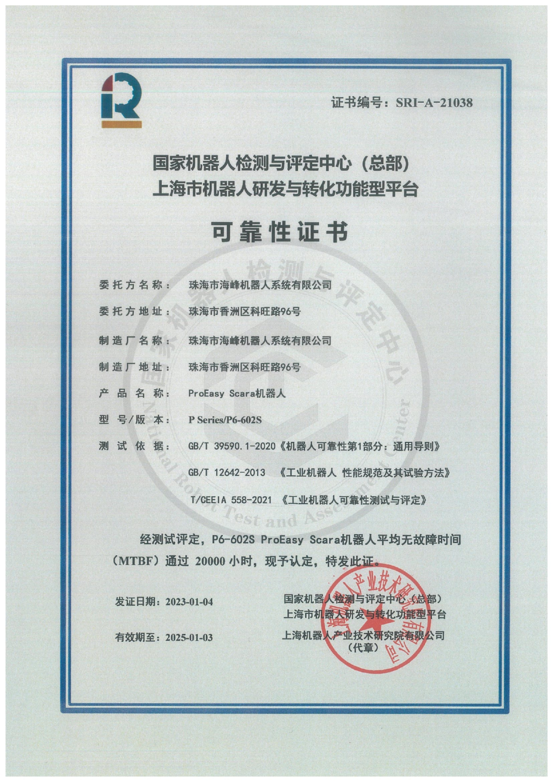 1月3日,珠海市海峰机器人系统有限公司的ProEasy 机器人P6-602s SCARA机器人顺利通过开云·Kaiyun集团)机器人有限公司官网的MTBF 20000小时测评。